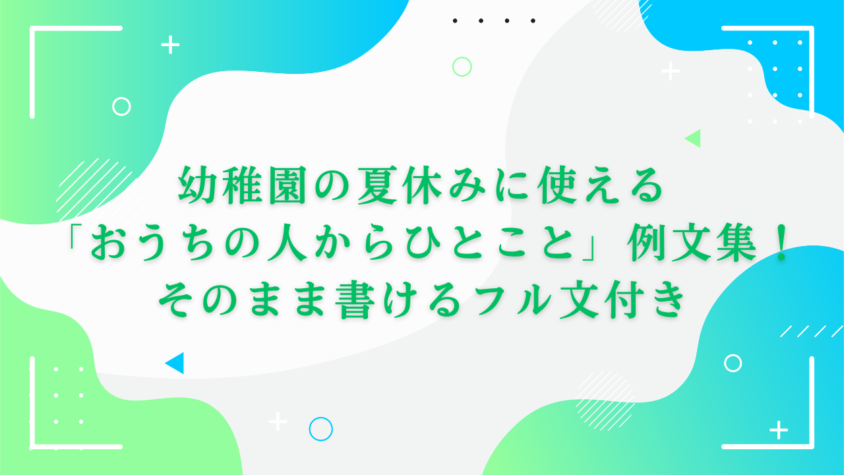 幼稚園の夏休みプリントにある「おうちの人からひとこと」。 ほんの数行とはいえ、いざ書こうとすると「何を書けばいいの?」と迷ってしまう保護者の方も多いですよね。 この記事では、夏休みの子どもの様子を自然に伝えられる短文・長文の例文を多数紹介...